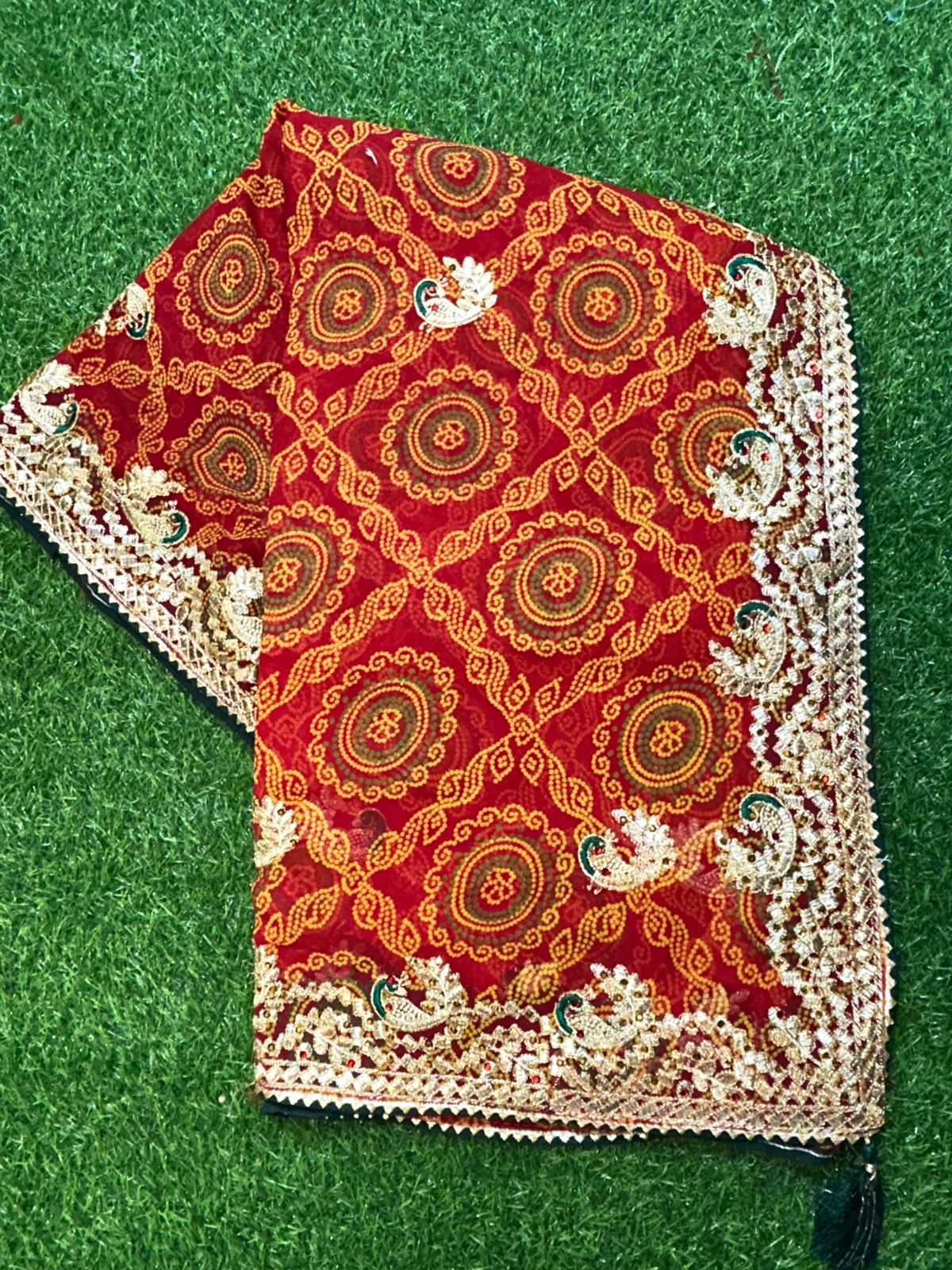 A red georgette saree featuring gotta patti work in a chunari design is available for purchase. The saree exudes elegance and sophistication, making it a perfect choice for formal occasions. Add a touch of traditional charm to your wardrobe with this exquisite piece.