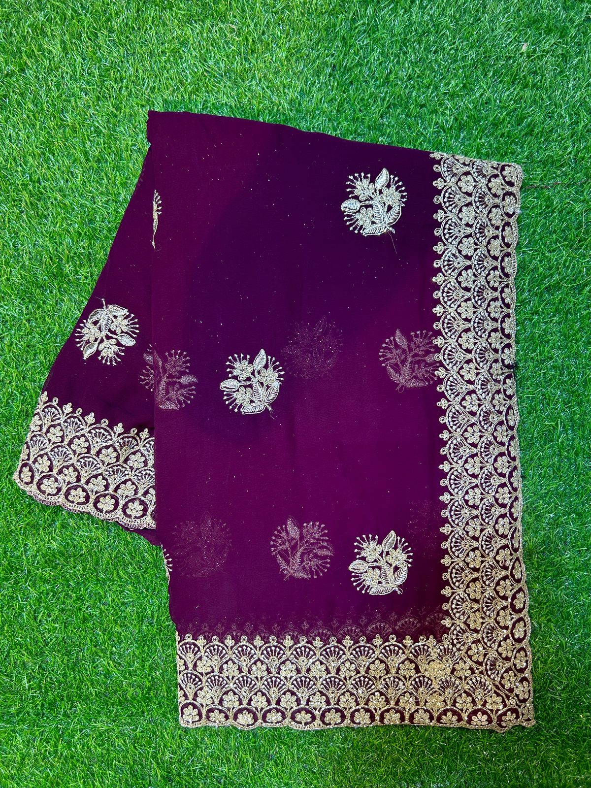 PURE GEORGETTE SAREE WITH GLITTER BORDER AND GLITTER WORK WITH HEAVY STONE AND BLOUSE WORK